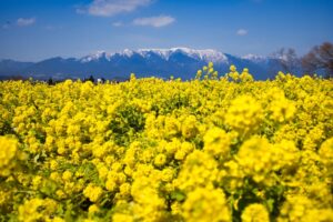カンザキハナナ(寒咲花菜)という名前の早咲きの菜の花が、面積約4,000㎡に約12,000本咲き、雪の残る比良山とのコントラストをお楽しみいただけます。